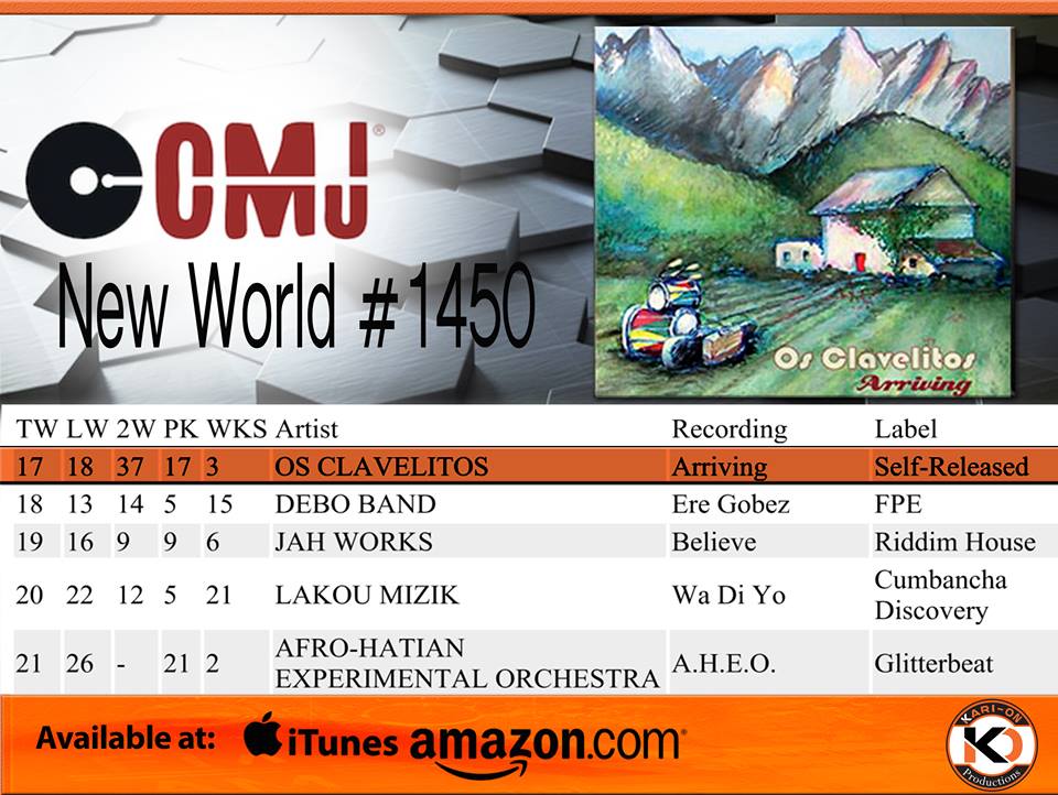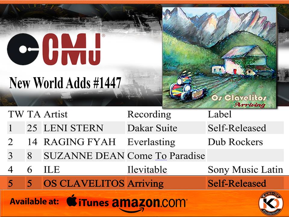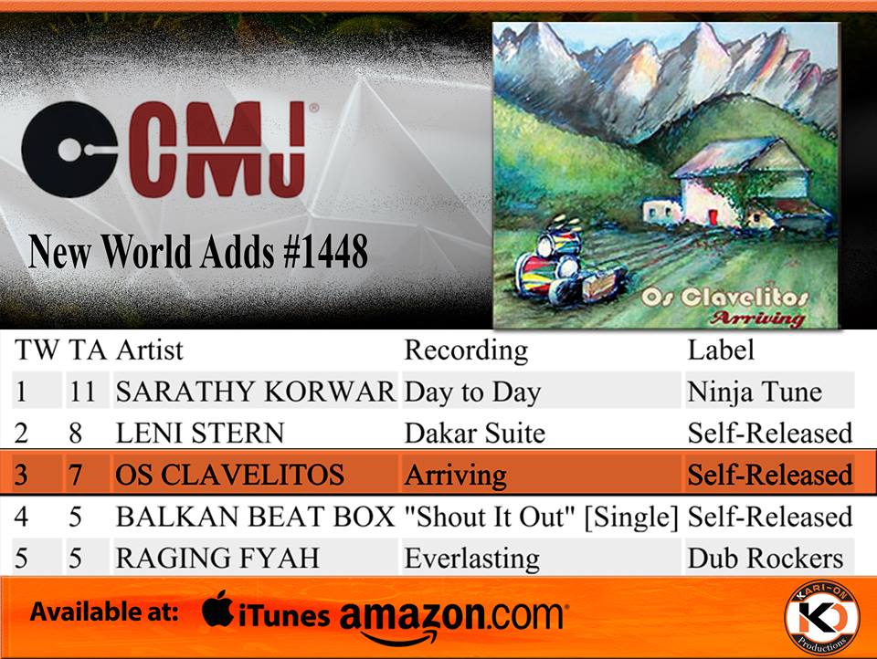 Os Clavelitos' album "Arriving" is #2 on the CMJ Top New World Adds Chart.