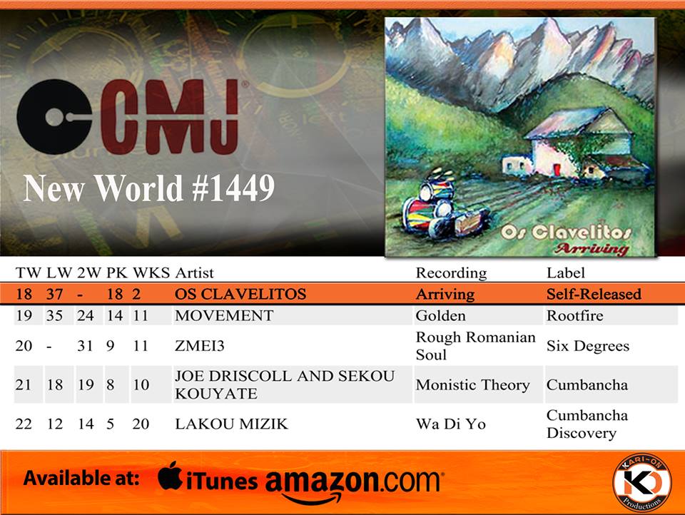 Os Clavelitos' album "Arriving" moves up to #18 on the CMJ Top 40 New World Chart.