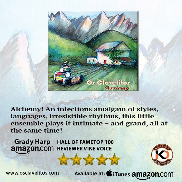 "shimmering debut release * Os Clavelitos - ARRIVING: A most fitting title for this shimmering debut release from this six-piece ensemble based in NYC...all-original compositions with the music of Brazil forming the basis for their high-energy tuneage! If you're not inspired (& maybe dancing) as you listen to the oddly-titled "Tom Cruise Samba", then you already have one foot (or maybe both of them) in the grave, lol...I give this high-energy group a MOST HIGHLY RECOMMENDED, with an "EQ" (energy quotient) rating of 4.97"
