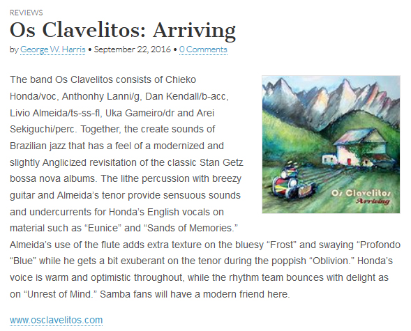 "Soft Brazilian jazz tinged music is what OS CLAVELITOS servers up on ARRIVING. This offers up a few Getz-like licks on 12 originals but that's not what is notable about this effort. What is notable is the relaxing Brazilian sound and the lyrics sung by Chieko Honda. The music and lyrics are provided by different band members and are quite interesting and it's additionally interesting to dwell on them as an 8 page lyric print-out comes with the CD. Its smoothness held up well to repeats."