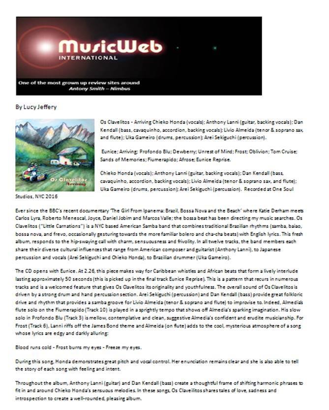 "This fresh album, responds to the hip-swaying call with charm, sensuousness and frivolity. In all twelve tracks, the band members each share their diverse cultural influences that range from American composer and guitarist (Anthony Lanni), to Japanese percussion and vocals (Arei Sekiguchi and Chieko Honda), to Brazilian drummer (Uka Gameiro)...This is a pattern that recurs in numerous tracks and is a welcomed feature that gives Os Clavelitos its originality and youthfulness."